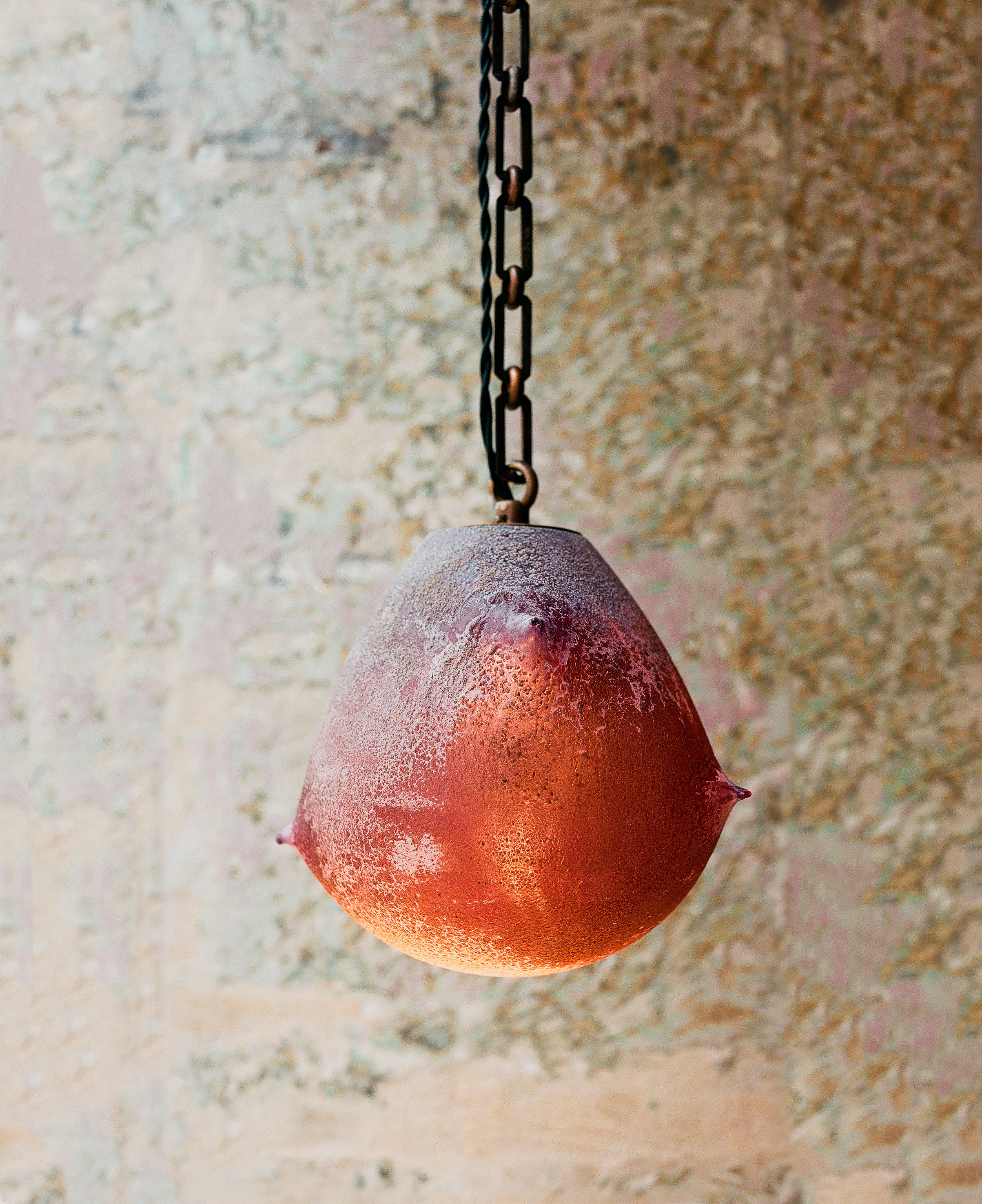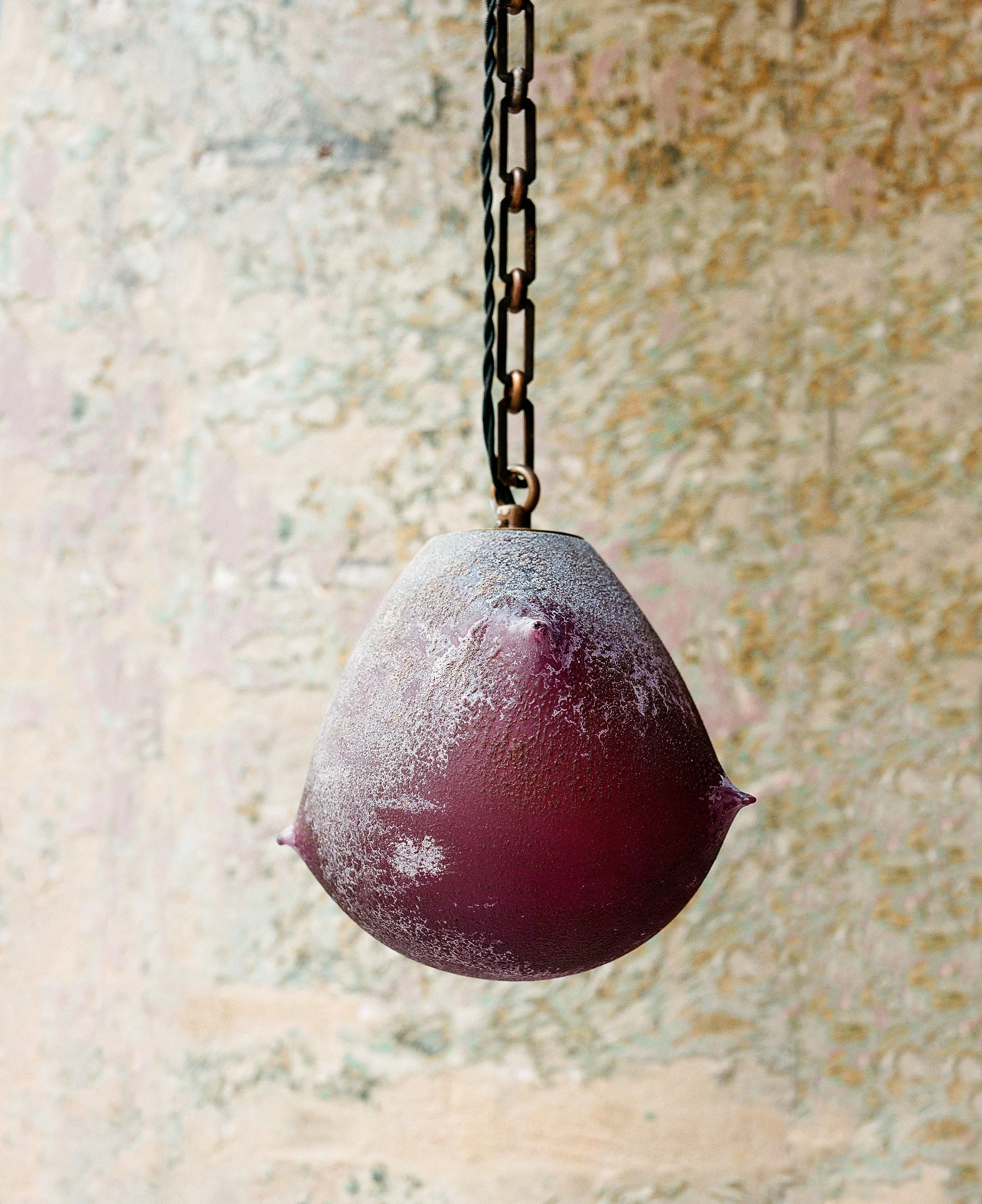 Materials: Hand-blown glass in custom Scavo patina in Amethyst gradient, Antiqued Bronze chain